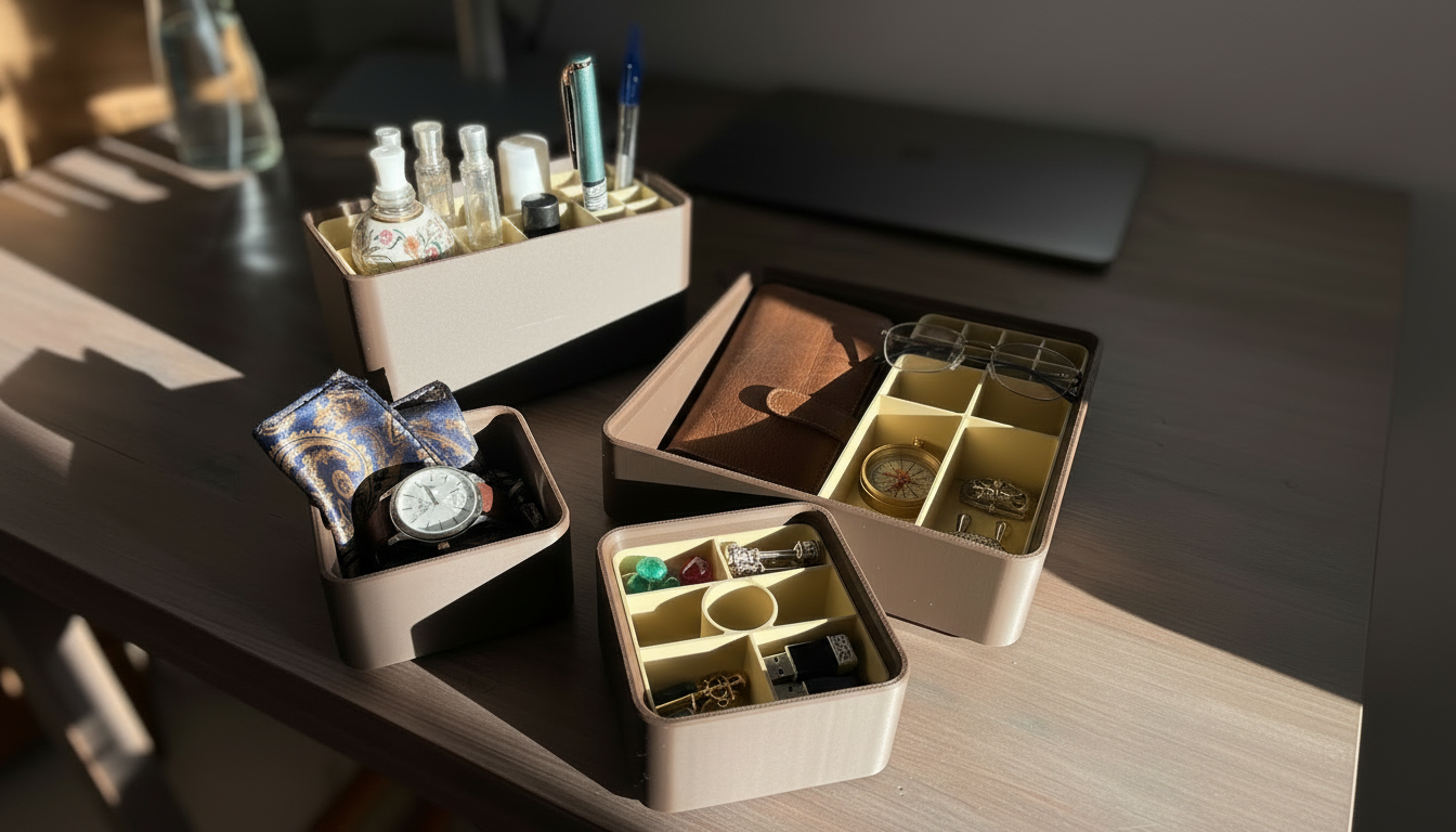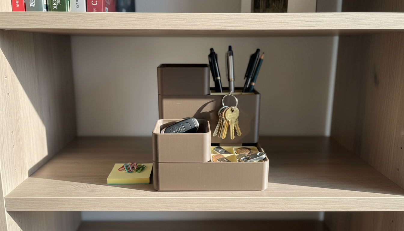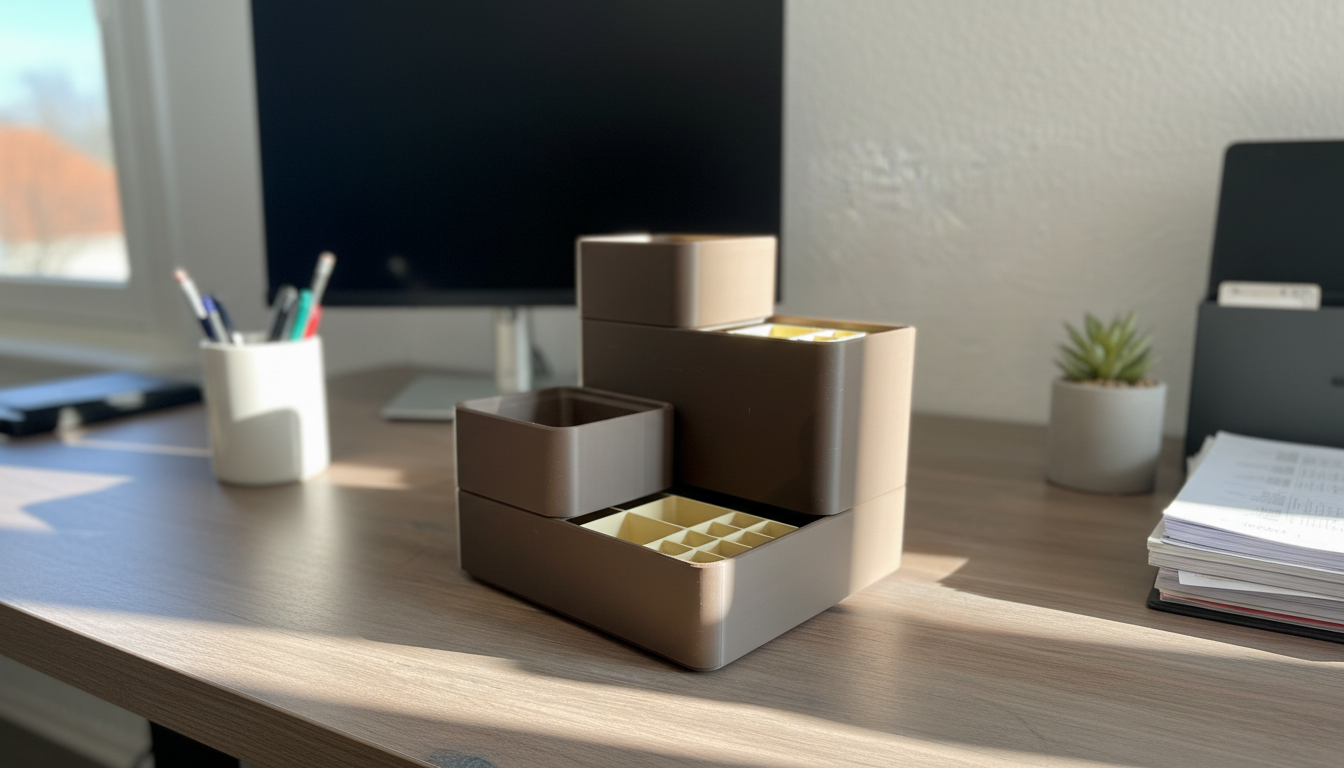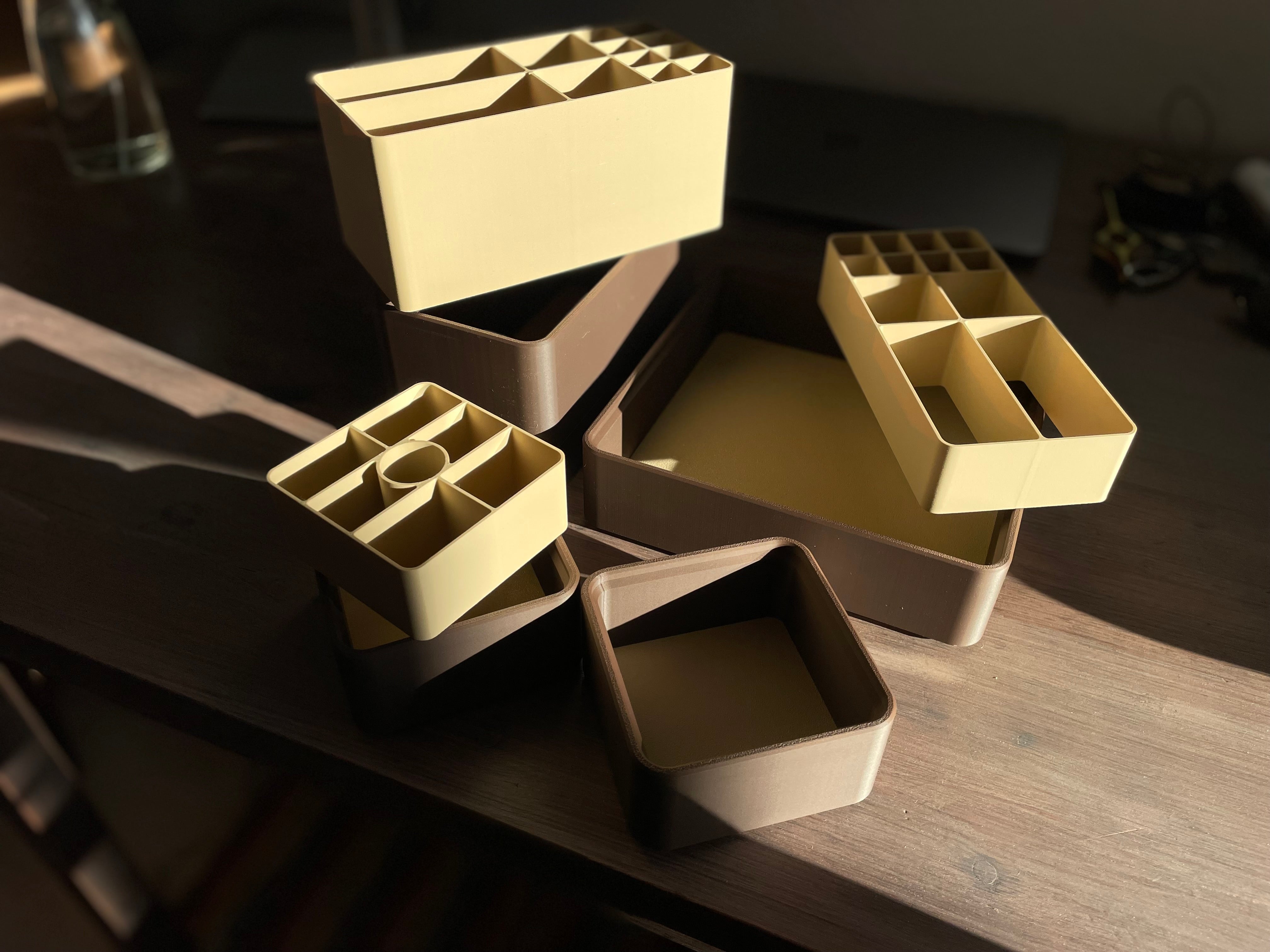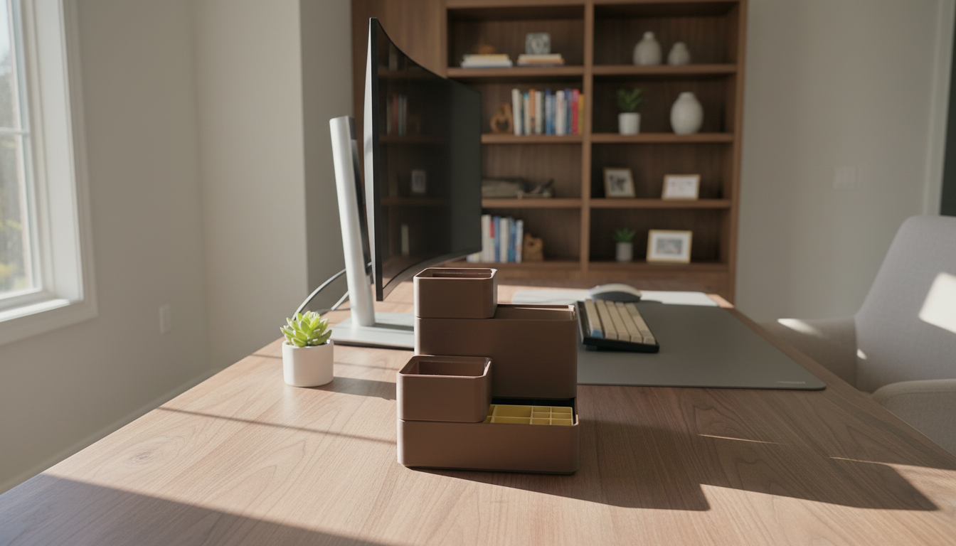 Bring calm and intention to your workspace with this modular desk organizer system. Designed to adapt as your day changes, each module stacks, slides, and rearranges effortlessly, letting you build the layout that feels right for you. Minimal, warm chocolate tones bring a refined aesthetic to any desk.