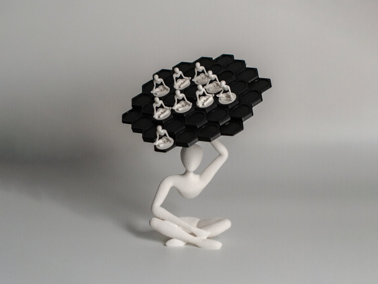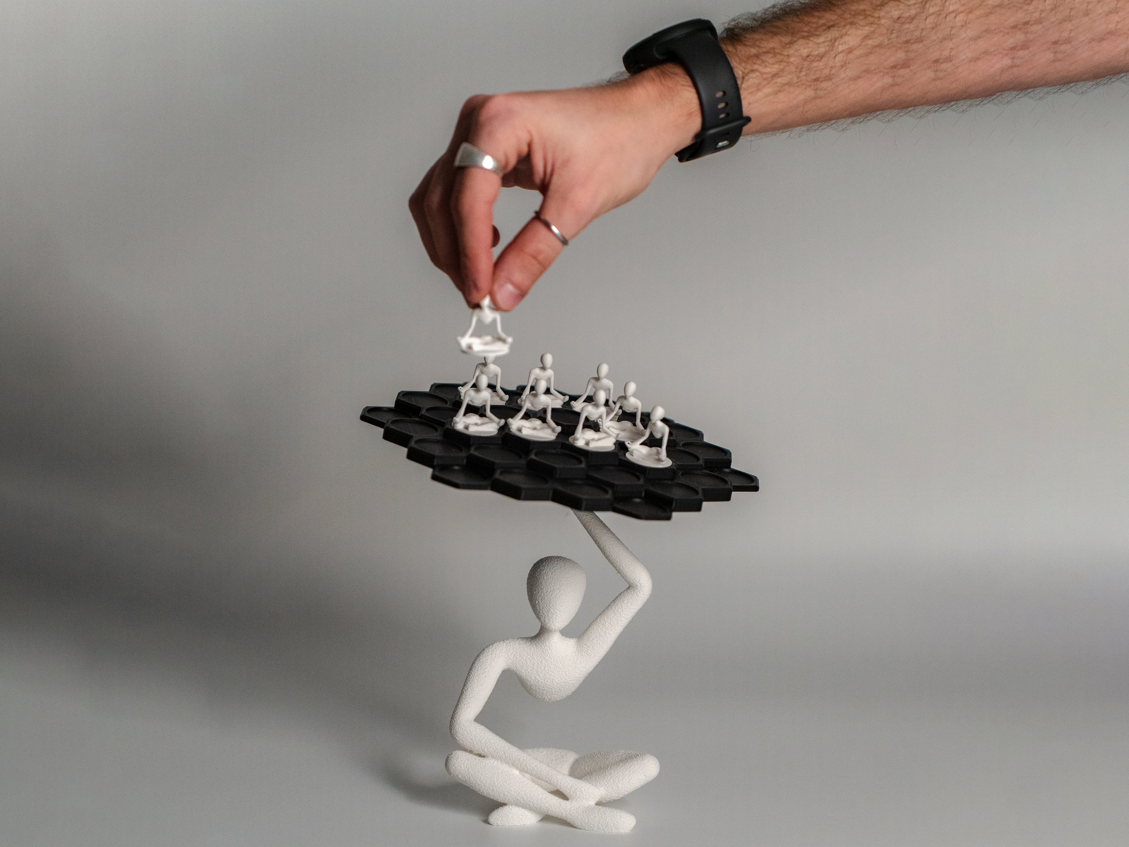 An elegant balance game inspired by the Solace aesthetic, combining minimal design with playful precision. Stack the pawns on the hexagonal platform and test steadiness and strategy, while appreciating the sculptural presence of the seated figure.